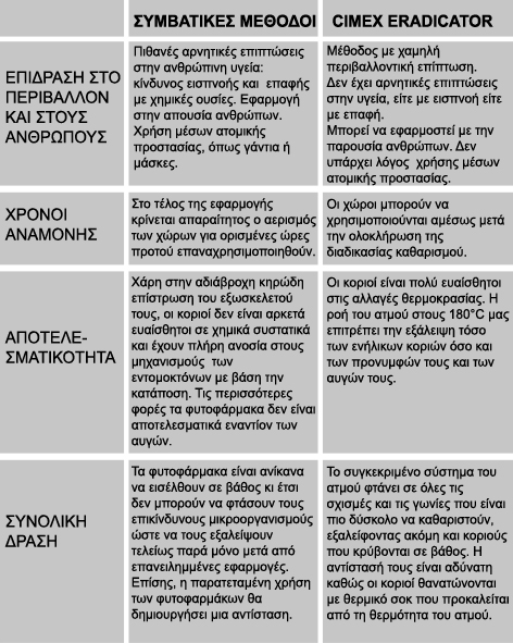 Παρακάτω, μπορείτε να δείτε τα πλεονεκτήματα της χρήσης του ατμού για την καταπολέμηση των κοριών, έναντι των πιο συμβατικών μεθόδων: